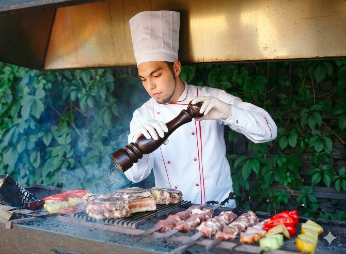 Parrillero experto para eventos exclusivos con gran show. Cortes técnicos y sabor ahumado directo a tu mesa.